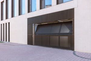 Zwei horizontale Flügel bilden die tragende Konstruktion. Beplankt mit 30 mm starkem Glas, fügt sich das Tor nahtlos in die hochwertige Glasfassade ein und bleibt trotz seiner Massivität Teil des architektonischen Gesamtbildes.