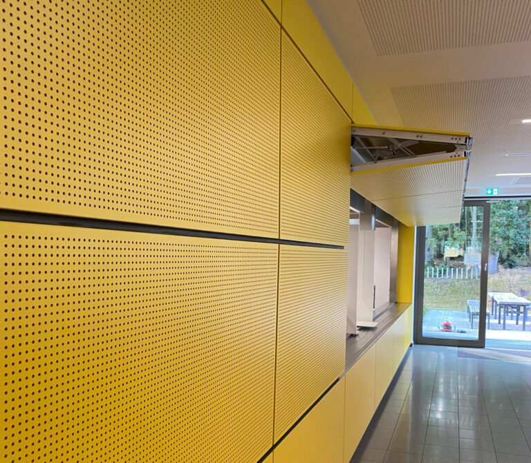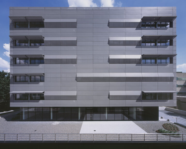 Zwei Rollgittertore ermöglichen die Ein- und Ausfahrt in das Parkhaus. Der Gitterbehang aus verzinktem Stahl trägt neben der halboffenen Fassade zu einem unkomplizierten Luftaustausch bei. Die einfache, robuste und flexible Konstruktion verbindet hohe wirtschaftliche Effizienz mit beachtlicher Sicherheit und ist trotz der Maße von 4.750 x 3.450 mm eine platzsparende Möglichkeit des Gebäudeverschlusses.